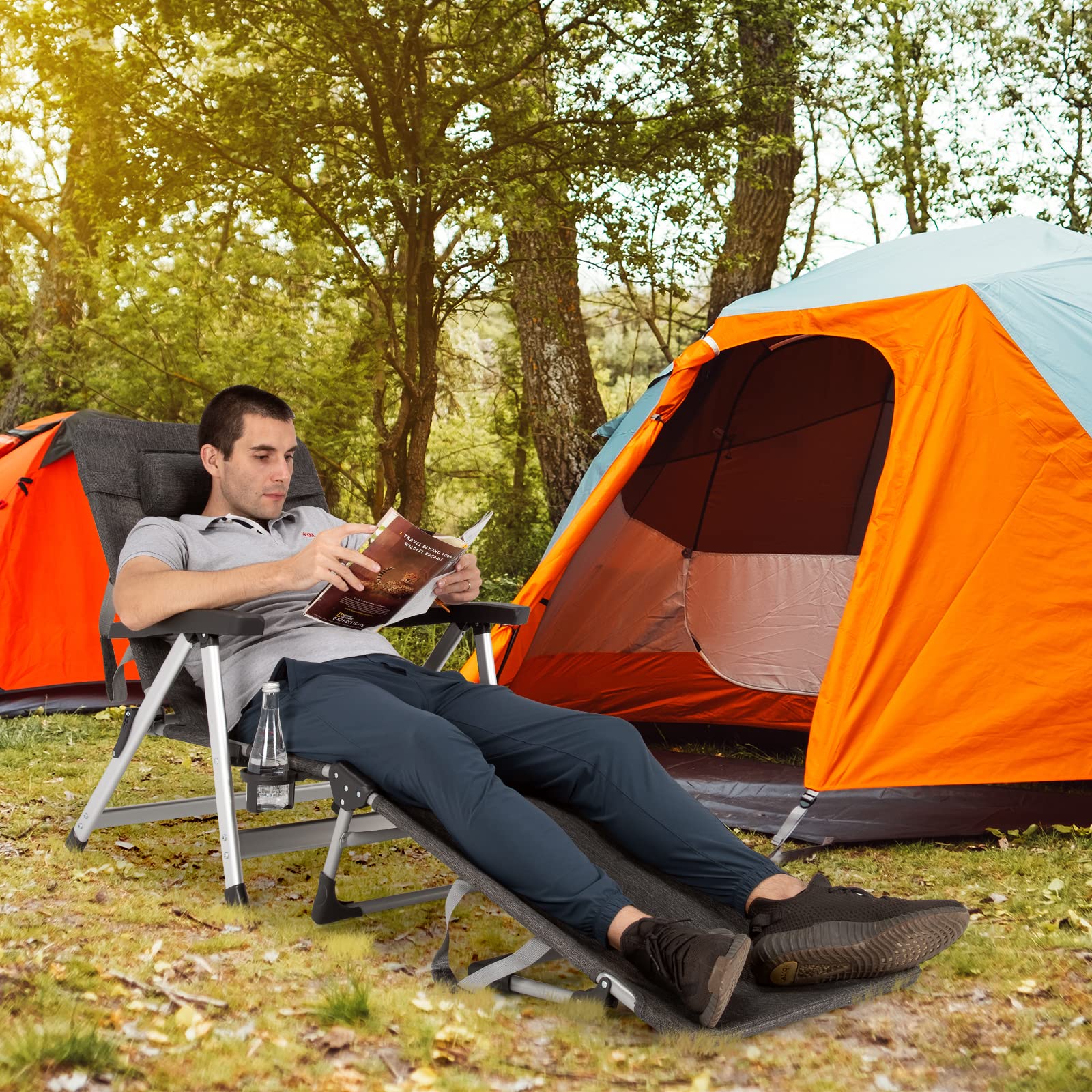 - Padded Headrest & Cup Holder: This considerate sleeping cot is equipped with a detachable pillow, providing super comfort for your head and neck. Besides, there is a rotatable cup holder near the armrest. It¡¯s easy for you to access your cup or water bottle when you rest on this lounge chair.